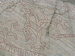 Op de steengravure van Ramsund zitten de mezen in de boom toe te kijken hoe Sigurd het hart van Fafnir braadt |